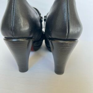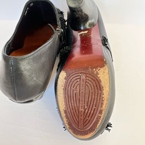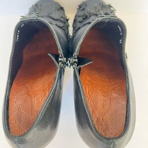 Chie Mihara Leather Chunky Fringe Heel Side Zipper Shoes in a size EUR 37 6.5 US. In great condition but does have minor wear to heels (see photos). Leather Upper, Sock and Insole Leather/ Outsole. Heels are 3.5”.