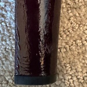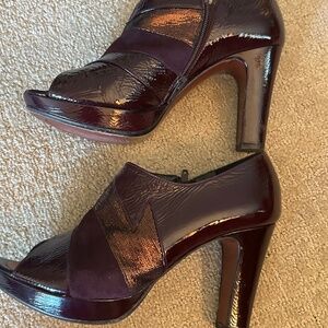 Fun 4” open toe booties by Chie Mihara. Purple patent leather and suede with bronze detail. Size 39