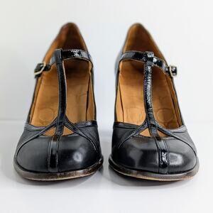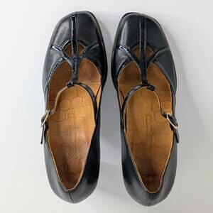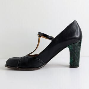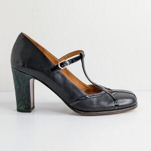 Chie Mihara T-Strap Heels 40 Black Green Snakeskin Accent Retro Glam Pinup Shoes