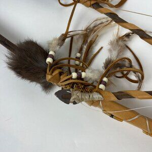 This intricately designed Chief Cross Bow wall hanging showcases a blend of natural materials and craftsmanship. Featuring a deerskin wrap and adorned with feathers and beads, this piece embodies the essence of endurance and bravery. Ideal for adding a cultural touch to office or home spaces. 49" wide.