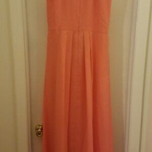 Bridesmaid/formal dress in a vibrant coral shade. Spaghetti strap halter style with slim keyhole back. Has pockets! Floor length. Zipper and clasps intact. Virtually no signs of wear.
