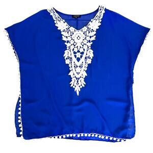 Chiffon Crochet Swimsuit Pullover Cover Up Womens S-M Blue White Beachy Vacation