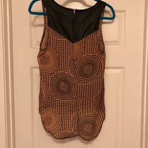 Chiffon top with black faux leather accents on shoulders and back yoke. Functional zipper in back. Dusty coral/rose and black color print. Jealous Tomato brand. Never worn.
