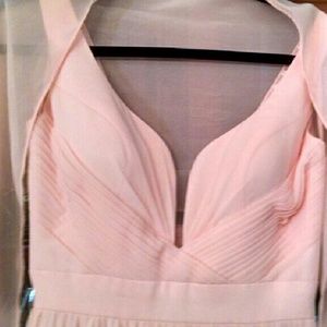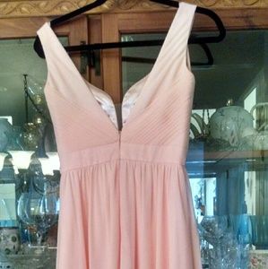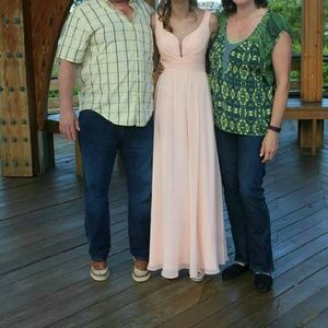 Long prom dress light pink. Fits a small with deep cut. Chiffon skirt and textured top.