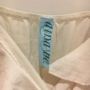 Chiffon material, synched waist, ruffle v-neck top, wrap-skirt styled bottom