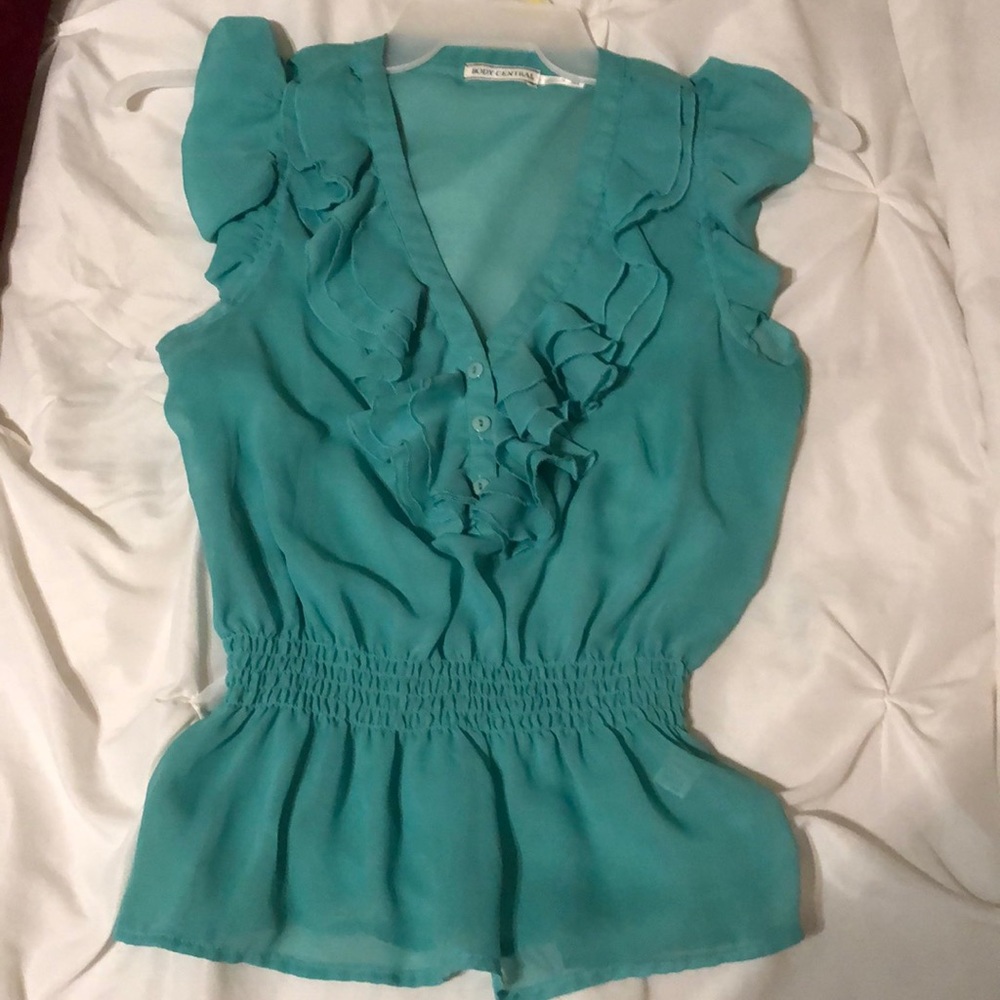 Super cute, lightweight top in pretty turquoise color. I love the feminine details. Size small, from Body Central.