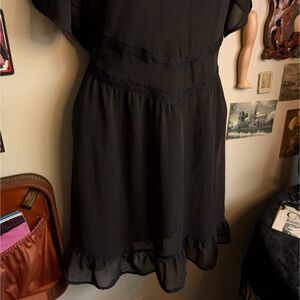 Chiffon V-Neck Mini Dress Women's Medium Black Mesh Short Sleeve Lace Trim