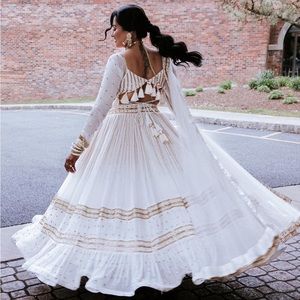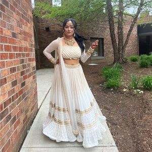 Chiffon White & Gold Beaded Lehenga - South Asian Indian Outfit —absolutely stunning. Hand beaded gold and white indian outfit. Comes with skirt, blouse and dupatta (scarf) & garment bag! It is heavy, in terms of weight, approx 7-8lbs due to the gold beading work.
