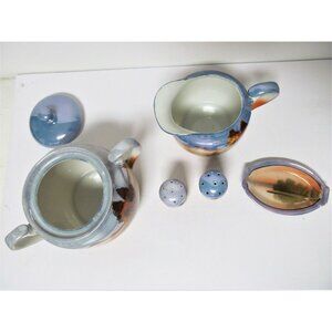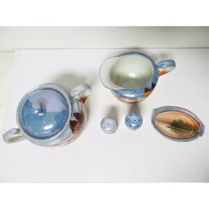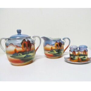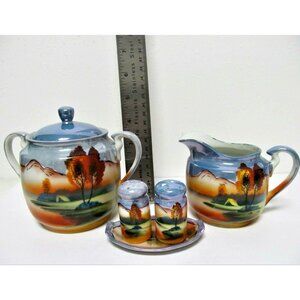 Chikaramachi handpainted scenic Lusterware sugar bowl with lid, creamer, salt & pepper shaker Set.