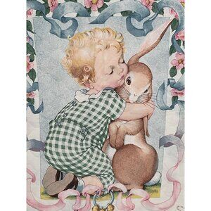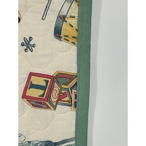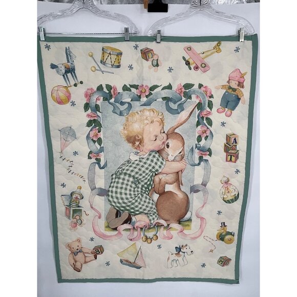 This vintage quilted baby blanket features a charming scene of a child embracing a bunny, surrounded by classic toys and playful designs.
