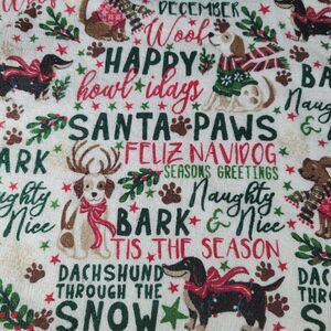 Absolutely adorable child's Christmas apron with an all over Holiday dog print. Hand made from a kitchen towel folded and sewn in half attached to a potholder with ribbon ties at the neck and waist. Perfect festive apron for your little dog lover to help with the holiday baking! Measures approximately 14½ inches by 19 inches (could be used by an adult but may not offer substantial coverage).