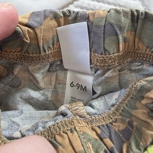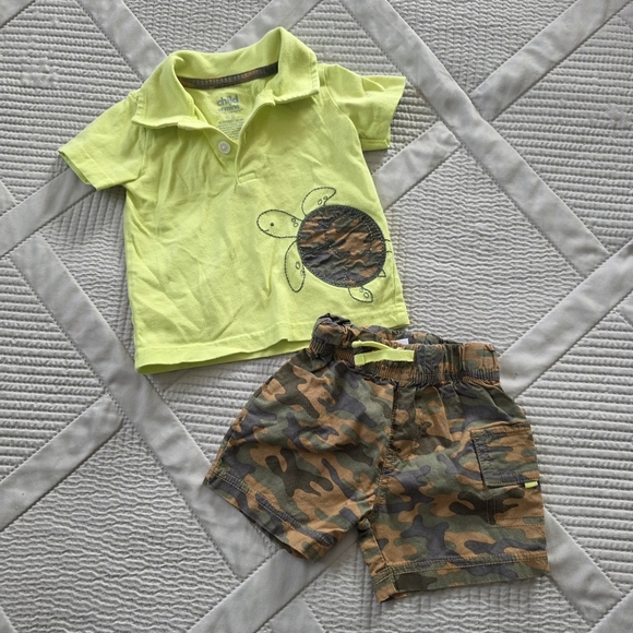 Excellent condition baby boy outfit from child of mine. Cute polo shirt with a camo turtle and matching camo shorts.