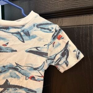Cute and comfy short-sleeve tee from Child of Mine by Carter’s featuring an allover shark print with pops of red. Soft cotton blend and great for everyday wear or summer outfits.