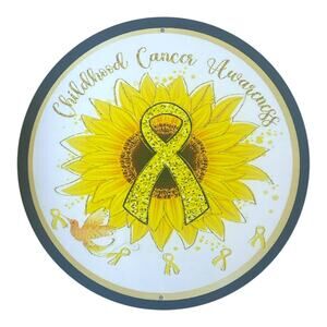 • 1 round metal sign with sunflower and gold ribbon design (Childhood Cancer Awareness theme)