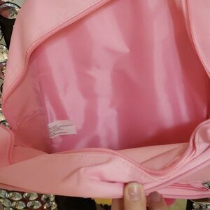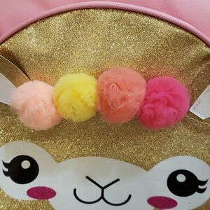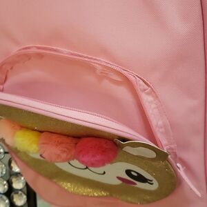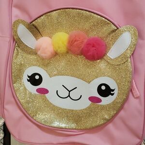 Child backpack light pink with animal glitter face on front pocket zippered. Brand new with tags ! 17inchs long x 12 inches wide ! Adjustable straps