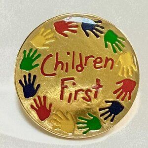 This enamel lapel pin features a vibrant design with multi-colored handprints and the phrase "Children First," set against a gold-tone background. Ideal for advocacy, education, or commemorative events, this pin adds a meaningful touch to attire. The pin is secured with a reliable back clasp, ensuring it stays in place.