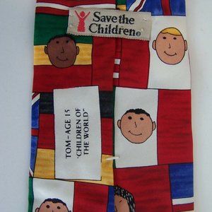 Ties are 57" long and 3 3/4" wide unless otherwize noted. All Save the Children Ties are 100% silk twill. Pictures of children and the flags of the countries they belong to are beautifully rendered on this Save The Children tie. This 1990's era silk tie is based on the peace and harmony of all nations around the world for the children's sake.
