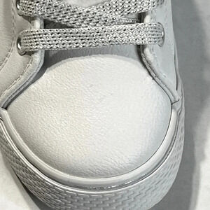 Children Place white low top girls lace up sneakers. Laces with metallic threading for added shimmer to shoes. Color: white Size 11C lining made of padded twill.
