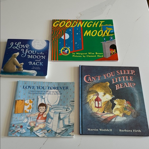 Set of four children's books. Includes 'Goodnight Moon' and 'Can't You Sleep, Little Bear?'. Perfect for bedtime stories.