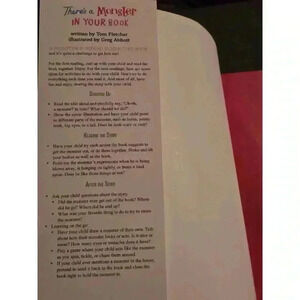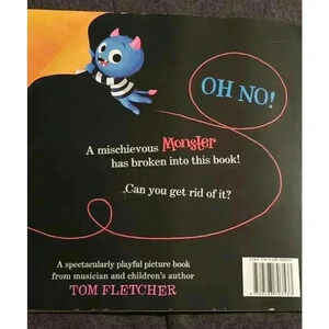 This is a pre-owned children's book titled "There's a Monster in Your Book" written by Tom Fletcher and illustrated by Greg Abbott. The book is published by Random House and features a colorful cover with a blue monster peeking out of a torn page. The book is in good condition with minor signs of wear. The pages are clean and free of tears or writing. The book measures approximately 8.5 inches by 11 inches. The back cover includes a brief description of the book and a barcode. The book is a fun and engaging read for young children.
