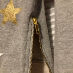 Colorful gold, white and black stars, cover this adorable grey shirt for children! Complete with gold zippers on the side,