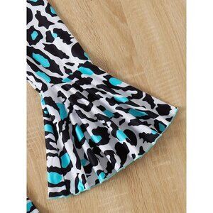 This adorable two-piece set features a love print trumpet long sleeve T-shirt paired with cow print trumpet long pants, perfect for stylish kids. Comfortable and trendy, it's ideal for everyday wear or special occasions.