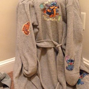 Child's Fleece robe , gray , Lilo and Stitch! Belt attached , sewn emblems of characters , worn maybe 5 times , like new !