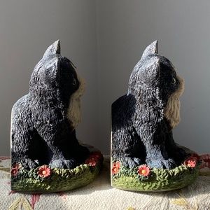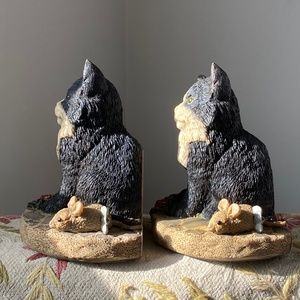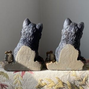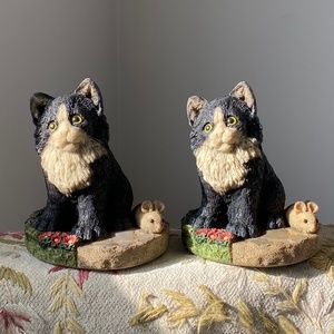 Perfect for a child's room or any cat lover! Each bookend features a black & white kitten with a wind-up toy mouse by its side. Made in 1994 by the old United Design Corporation (UDC) of Noble, OK, these were part of their Children's Garden of Critters collection. They are in VGUC, w/wear to the felt backing & very little base wear. Amazing detail, particularly the eyes, and the nice outdoor touches of red flowers, grass and cobblestone.