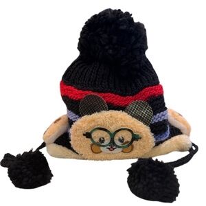 Keep your little one cozy and cute with this fun and warm knit toboggan! Featuring a charming character design with glasses and fuzzy ears, bold stripes, and a fluffy pompom on top, this hat is perfect for chilly days. The ear flaps and braided tassels add extra warmth and style, making it a winter essential for kids.