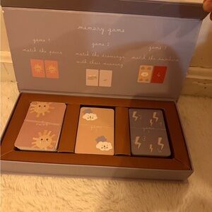 Adorable Zara children's memory game box with playful designs. Features sun, moon, and cloud illustrations on a purple background.never used got as gift