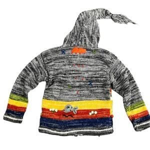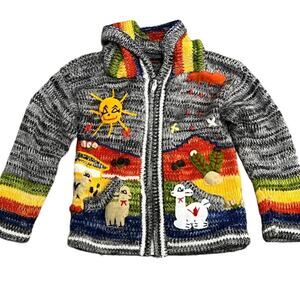 Unique gray children’s peruvian zipper Albinaas knit hoodie sweater jacket in a rainbow of colors. Tassel on hood. Beautiful kids long sleeve zip cardigan features colorful animals, rain & sun. Full zipper with hood.