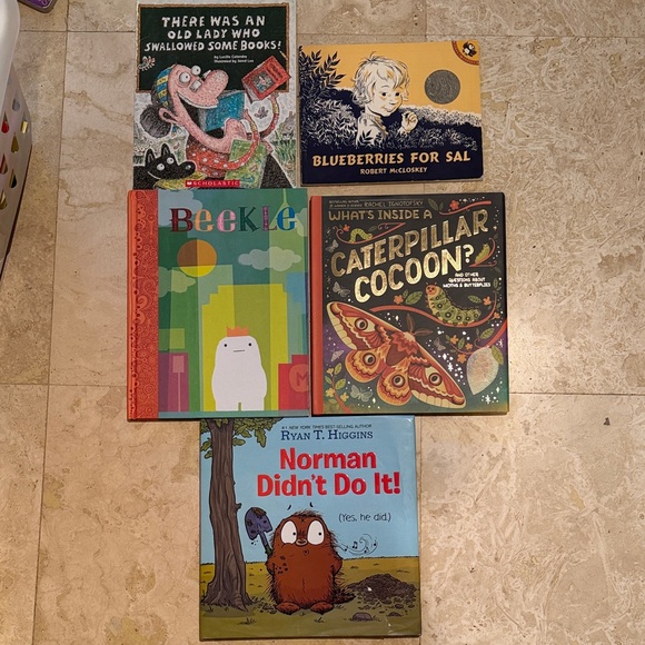 Set of colorful children's picture books. Includes titles like 'Blueberries for Sal' and 'Norman Didn't Do It!'. Perfect for young readers.