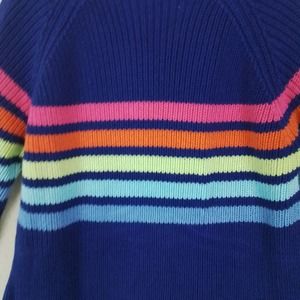 This Cotton/Acrylic blend sweater is soft, warm, and perfect for cooler weather. This basic sweater has a scoop neck, long sleeves, and ribbed wrist/hem. The blue has a purplish hue and the stripes are pink, orange, green, and blue. This knit is preloved and in excellent condition with no major flaws and little to no signs of wear.