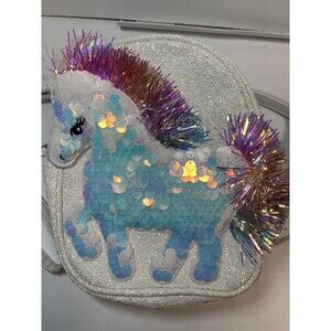 Adorable fun flip sequin unicorn backpack with iridescent faux fur and white glitter background. Made of 100% faux leather. Adjustable straps. Measures 8.75 inch height by 7.5 inch length by 3 inch wide. Brand new without tags. Comes from a smoke free home.
