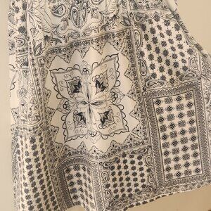 Color: Navy and white with allover paisley or bandana-style patchwork print