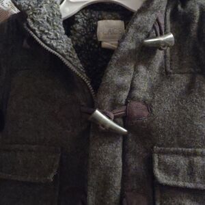 Children's Place Baby 0-3 months 65% wool 28% polyester 7% other fiber lining 100% polyester machine washable hooded jacket Gray zip and button bottom button is partially broken otherwise excellent condition