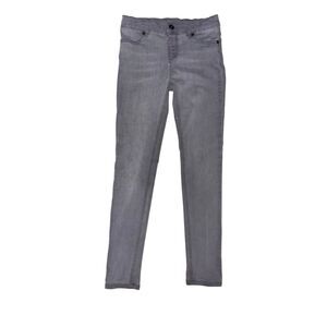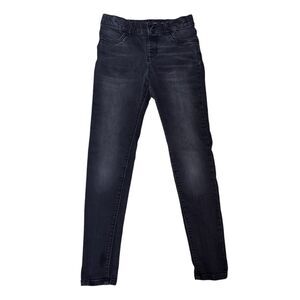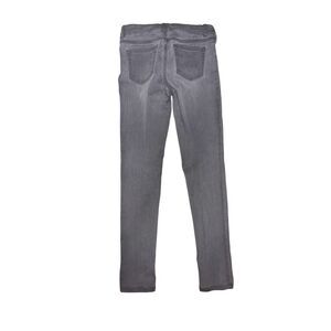 Blue, gray and faded black legging jeans. Adjustable waist. Back pockets. Belt loops. Button closure. 64% cotton/34% polyester/2% spandex. Size: 12. Preowned in good condition.