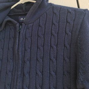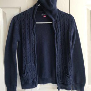 Navy blue, cable knit sweater is stylish yet warm. The color has held up well, with light fading overall. The hood does not have a drawstring to tighten it, but when used as needed or in conjunction with a beanie, it works just fine!