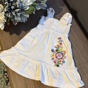 This adorable white dress with stretch elastic bodice, iridescent flower buttons and embroidery down the front is simply precious. It’s 100% cotton, no stains or tears