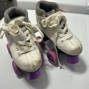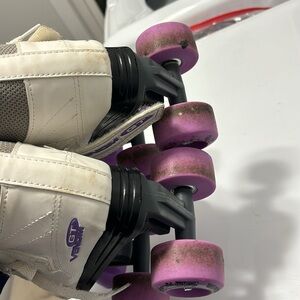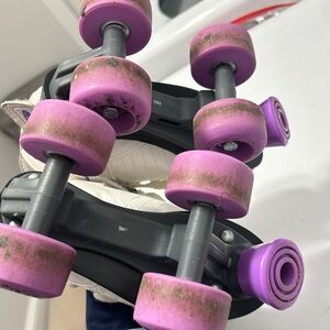 Stylish roller skates with purple wheels. Perfect for skating enthusiasts. Have been well loved but lots of life left. Size 1.