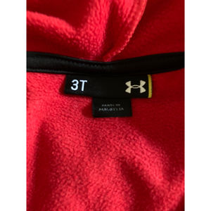 Children's Under Armour hooded zippered red/black jacket size 3T trimmed in black. Measure 13" across chest, 10" armpit to cuff, 15-1/2" length.