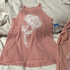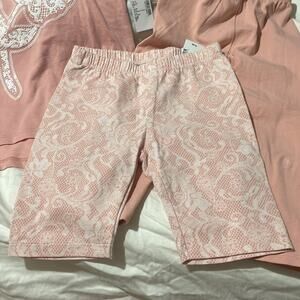 Children’s Place set of pale pink capri pants bike shorts and trapeze tank with cream flower graphic lace design . Bike shorts are all over lace cream over pink and are perfect match . Capris are solid same pink 5-6 and coordinates nicely NWT follow game spring summer fall coastal contemporary beach park play casual camp school