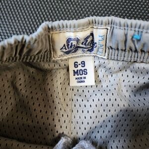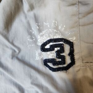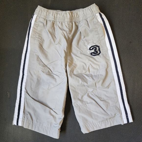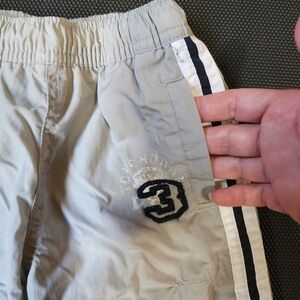 These were one of my favorite pants for my son. Want to know why? When your baby is walking or kicking his feet you get to hear him swish and swoosh everywhere as the pants rub together! These light grey track style windbreaker pants are fully lined with a lightweight mesh so baby won't get hot but stay protected at the same time. White with navy stripe piped down the side of each pant leg. White felt number 3 on the left pant leg. Fully functioning pockets on each side. Velcro closed functioning pocket on back right side of pants. Drawstring closure with elastic waistband. In great used condition. Children's place brand. Size 6-9 months.