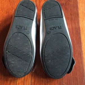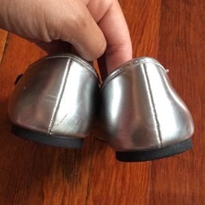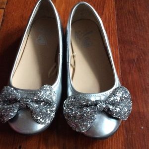 Silver flats with glitter bows in the front. Size 12 and in very good condition