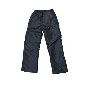Black fleece lined snow pants. Velcro closure pockets. Zipper and snap waist closure. Elastic boot cover. Shell/lining/filling: 100% polyester. Size: 10. Preowned in good condition.