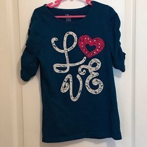 Children’s Place size large 10/12 beautiful blue top hearts and love on it crocheted 100 percent cotton wash gentle cycle 21 inch length 14 inch. Pit to pit P1C79