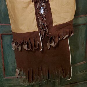 Top is a Vest-like shirt with brown faux suede fringe sewn down the front, accenting the arms and collar / front of shirt, You can use 2 pieces of fringe to tie together wherever needed to 'button-up' or leave open. The rest of the Material is a cotton or cotton-like beige. There is an Indian-style emblem of a bird drawn on the back in magic marker. It measures approximately 27" from top of back of neck to bottom of fringe; Approximately 19" from pit to pit. From top of waist to bottom fringe it's app. 16"