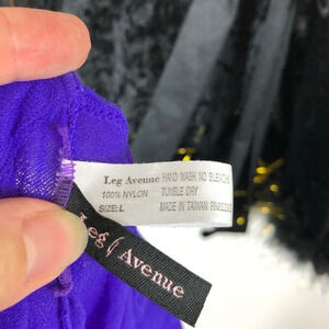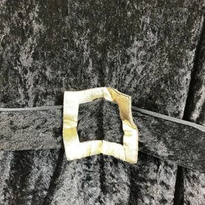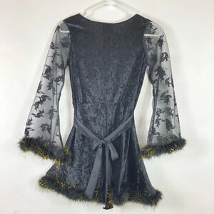 Velvet body with sheer sleeves with with print. Gold sparkly feather trim to bottom and cuffs. Waist tie belt. Coordinating striped tights. I’m including these as they were worn together. The tights have some minor snags to foot area.