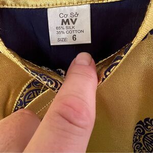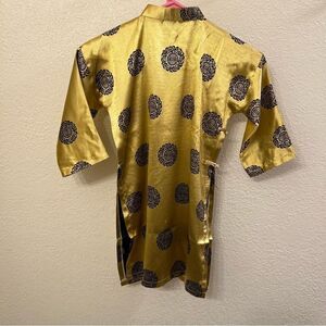 This gold Asian child’s outfit is from Co So. This cute outfit is made 65% silk and 35% cotton. The size is 6. The measurements are 26” L x 17” W (pit to pit) x 11” sleeve (shoulder to cuff). This outfit has been gently worn but is in very good condition.