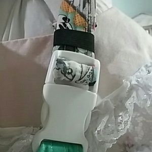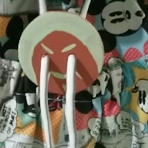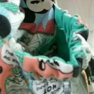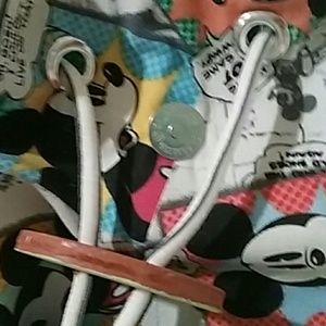 This child's Mickey mouse hand made custom book bag has a drawstring closure with a custom wooden button along with a magnetic snap the strap is adjustable and had a clip for easy removal all parts are sewn into the bag is about 12 inches tall by about 10 inches wide and had 1ibside zipperd pocket